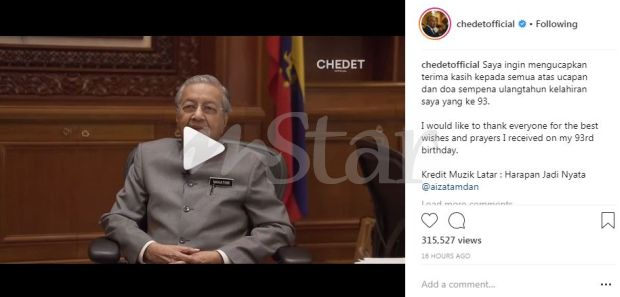 SEMPENA ulang tahun kelahiran Perdana Menteri, Tun Dr Mahathir Mohamad atau Tun M ke-93 pada Selasa, beliau memuat naik video ucapan terima kasih kepada rakyat Malaysia yang mendoakannya.