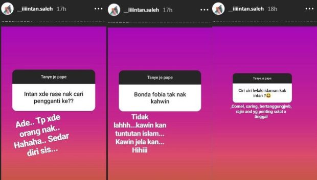 Intan berkata demikian sebagai menjawab beberapa soalan secara rawak daripada pengikutnya di Instagram menerusi fungsi pertanyaan yang diperkenalkan di Instagram Story.