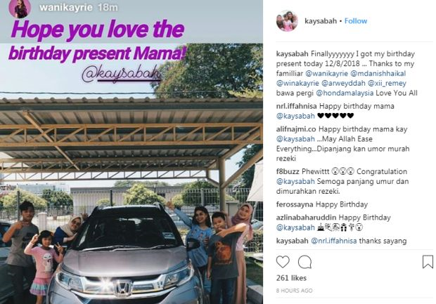PETALING JAYA: Penyanyi Wani Kayrie membuat kejutan apabila menghadiahkan sebuah kereta jenis Honda BRV kepada ibunya, Kay Sabah bersempena ulangtahun ke-40 wanita itu. Wani menerusi Instagramnya memberitahu dia membeli kereta itu hasil daripada rezekinya dalam bidang nyanyian dan memilih Honda BRV yang menjadi pilihan ibunya. "Alhamdulillah. Tahun ini ada rezeki lebih kita hadiahkan Mama kereta yang dia nak. "Selamat hari jadi Mama @kaysabah. Harap Mama suka dengan hadiah daripada kami! Kay teruja dengan hadiah diberikan oleh anaknya. "Semoga panjang umur dan dimurahkan rezeki sentiasa. Semoga sentiasa kekal muda dan terus bertenaga! Sayang Mama!," tulisnya. Wani turut memuat naik video dia membuat kejutan kepada ibunya pada Ahad. Menerusi video itu memperlihatkan ibunya yang berbaju blaus biru memakai penutup mata sebelum anak-anaknya membuat kejutan dengan memberikan kereta tersebut. Kay yang terkejut dengan hadiah itu dilihat terus memasuki kereta berwarna kelabu itu dan memeluk anak-anaknya sebagai tanda terharu dan terima kasih. Sementara itu, Kay menerusi Instagramnya memberitahu teruja dengan hadiah tersebut dan tidak menyangka mendapat hadiah hari jadinya. "Akhirnya saya dapat hadiah hari jadi saya hari ini! Terima kasih, Mama sayang anda semua," tulisnya. Alhamdulillah. Tahun ni ada rezeki lebih kita hadiahkan mama kereta yang dia nak ?❤ Happy 40th birthday mamaku @kaysabah ?? Hope you love the present from us! Semoga panjang umur & dimurahkan rezeki sentiasa! Keep being young & keep rockin! Love you momsie! ?✨ Thank you @hondamalaysia ! #MamaKayTurns40 A post shared by WANI KAYRIE ♡ (@wanikayrie) on Aug 12, 2018 at 1:46am PDT