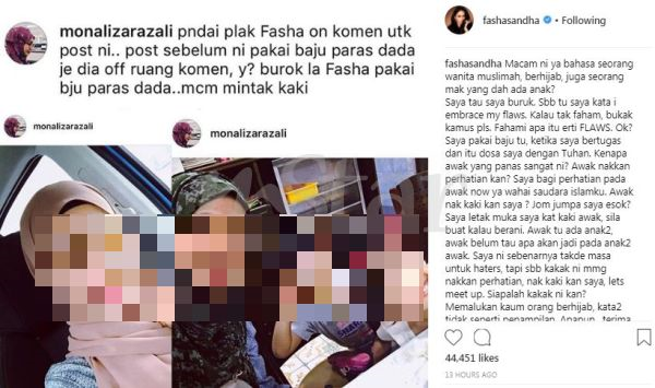 Fasha turut memuat naik foto wanita itu yang didakwa menulis komen negatif menegur tentang baju paras dada yang dipakai Fasha pada salah satu foto di Instagram miliknya.