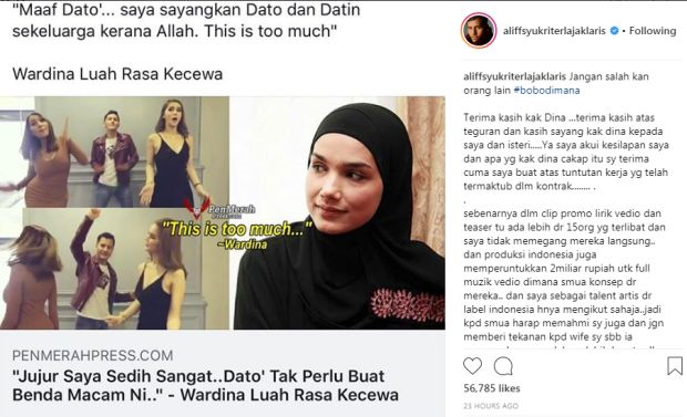 Dalam posting terbaharu di Instagramnya, Aliff turut berterima kasih di atas teguran Wardina terhadap video tarian yang dimuatnaiknya tiga hari lalu.