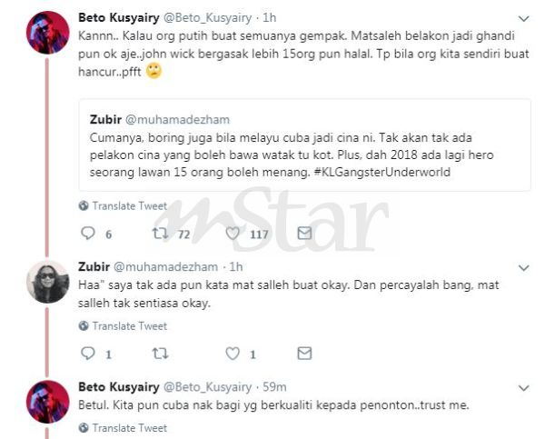 "Kalau orang putih buat semuanya gempak. Mat salleh belakon jadi Ghandi (Mahatma Gandhi) pun ok aje... John Wick bergasak lebih 15 orang pun halal. Tapi bila orang kita sendiri buat hancur..." tulisnya di Twitter.