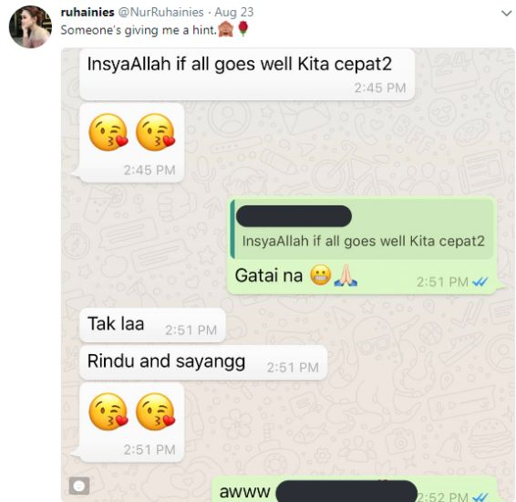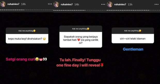 PELAKON Ruhainies memberi bayangan hatinya sudah dimiliki ketika menjawab soalan secara rawak daripada pengikutnya menerusi fungsi pertanyaan di Instastory. Ketika ditanya siapakah jejaka yang berjaya menambat hatinya, Ruhainies memberitahu dia akan mendedahkan jejaka istimewa itu untuk tatapan umum. "Tulah. Finally! Tunggu suatu hari nanti saya akan dedahkan," jawabnya. Ruhainies menjawab soalan daripada peminat di InstaStory. Sebelum ini, Ruhainies pernah dikaitkan mempunyai hubungan dengan pemain bola sepak pasukan Johor Darul Tazim (JDT), Safawi Rashid namun menegaskan mereka hanya sekadar rakan. Baru-baru ini dia dikatkan pula sedang mengenali rapat seorang jejaka yang dipercayai ahli perniagaan namun tidak pernah mendedahkan wajah lelaki itu di media sosialnya. Namun Ruhainies ada memuat naik paparan skrin perbualan romantis dipercayai dengan kekasihnya itu di Twitter. Ruhainies turut memuat naik paparan skrin perbualan dipercayai dengan teman lelakinya. Dalam pada itu, menjawab soalan lain, Ruhainies secara bergurau memberitahu dia tidak mahu mendedahkan identiti teman lelakinya itu kerana bimbang ia akan diambil orang. "Satgi orang curi," katanya ringkas. Pelakon itu juga memberitahu lelaki budiman adalah ciri-ciri yang dicarinya dalam diri seorang jejaka.