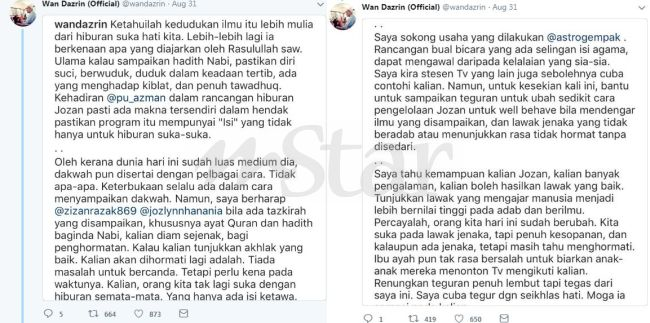 "Keterbukaan selalu ada dalam cara menyampaikan dakwah, namun saya harap Zizan Razak dan Johan bila takzirah disampaikan, khususnya ayat Quran dan hadith baginda Nabi, kalian diam sejenak, bagi penghormatan.