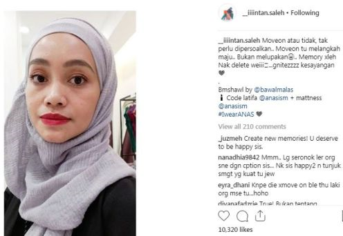 "Move on atau tidak, tak perlu dipersoalkan. Move on tu melangkah maju bukan melupakan. Kenangan tidak boleh dipadamkan," tulisnya.