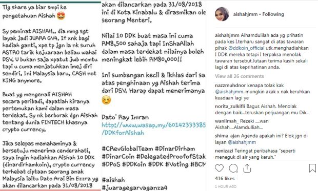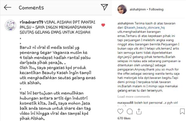Menurut Aishah, sebuah syarikat produk kecantikan ingin menghadiahkan seutas gelang emas manakala ada pihak turut menawarkan mata wang crypto sebanyak 10 Dinar Dirham Koin (DDK) bersamaan RM8,500.