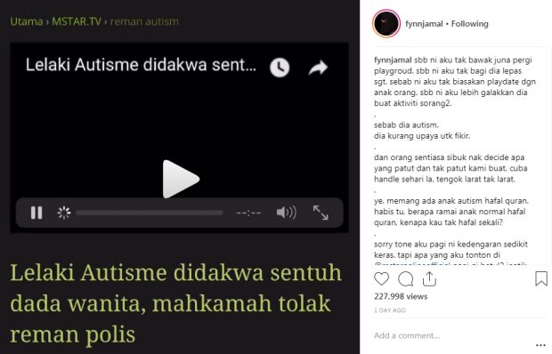 BERITA mengenai penahanan seorang lelaki autism berusia 22 tahun yang dipercayai menyentuh dada seorang wanita pada Selasa lalu mendapat perhatian Fynn Jamal yang turut terkesan dengan insiden itu.