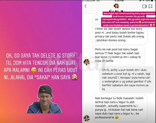 "Baru nak remove (padam) posting instastory saya tadi atas budi bicara pengasas dia yang baik tapi ejen dia yang lebih-lebih. Dia yang salah tapi dia nak sound kita macam ni?