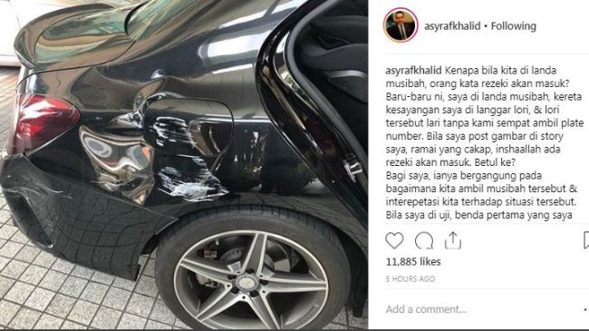 "Baru-baru ni, saya dilanda musibah, kereta kesayangan saya dilanggar lori dan lori tersebut lari tanpa sempat ambil nombor plat.