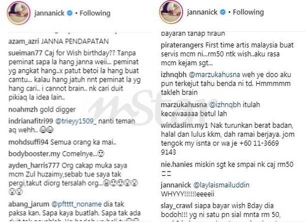 "Dah boleh tukar nama tu daripada Janna Nick kepada Janna pendapatan! Mahal sangat," komen netizen.
