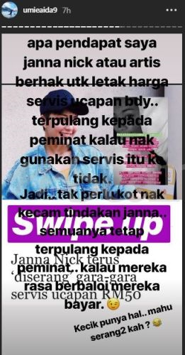 "Pendapat saya, Janna Nick atau artis berhak untuk letak harga servis ucapan birthday, terpulang kepada peminat kalau nak gunakan servis itu atau tidak.