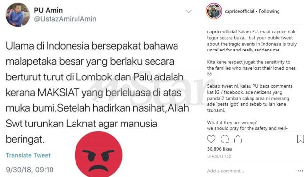 "Salam PU, maaf Caprice nak tegur secara buka. Tapi tweet umum anda tentang peristiwa tragis di Indonesia benar-benar tidak dipedulikan dan amat menyedihkan saya.