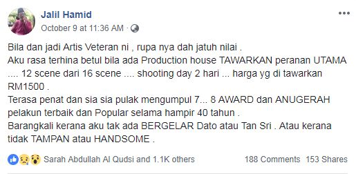 PETALING JAYA: Pelakon terkenal Jalil Hamid meluahkan rasa terkilan apabila ditawarkan bayaran sebanyak RM1,500 bagi membintangi sebuah drama.