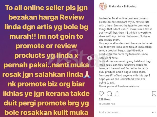 "Jadi lebih baik Linda cuba dulu produk dan kalau bagus Linda kongsi. Saya minta maaf kalau saya kecilkan hati mana-mana pihak dengan kenyataan ini.