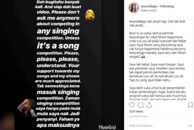 "Buat masa ini saya lebih suka menyanyi di persembahan pentas yang diundang syarikat tempatan dan antarabangsa atau untuk aktiviti amal di Instagram ini yang saya sedang jalankan untuk rumah Nurhati. Mohon semua untuk beri sokongan yang seperti selalunya!," jelasnya.