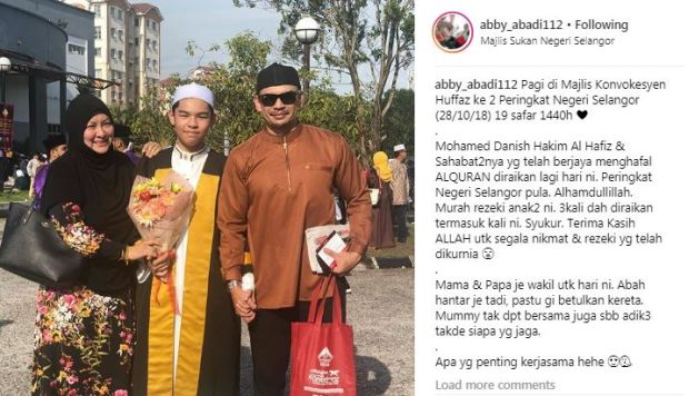 "Mama dan papa je wakil untuk hari ni. Abah (Jaiezzany) hantar je tadi, pastu gi betulkan kereta. Mummy (Memey Suhaiza) tak dapat bersama juga sebab adik-adik tak ada siapa yang jaga. Apa yg penting kerjasama hehe...," tulisnya di Instagram.