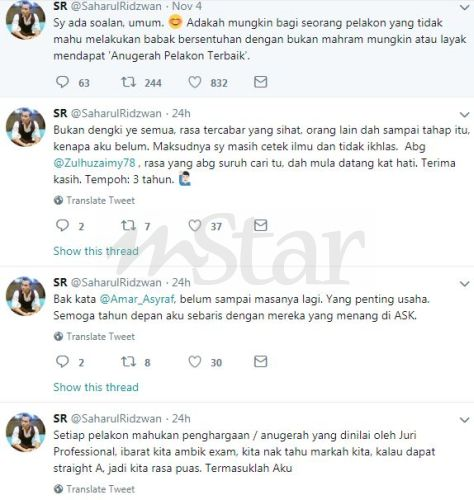 Menerusi laman Twitter, Saharul ada memuat naik pertanyaan adakah pelakon yang tidak melakonkan babak bersentuhan layak untuk memenangi anugerah Pelakon Lelaki Terbaik.