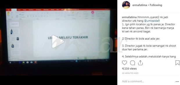 "Hmmm... Syarat-syarat nak jadi pengarah untuk hang (awak) @umieaida9. Jangan pilih lokasi yang tak panas saja.