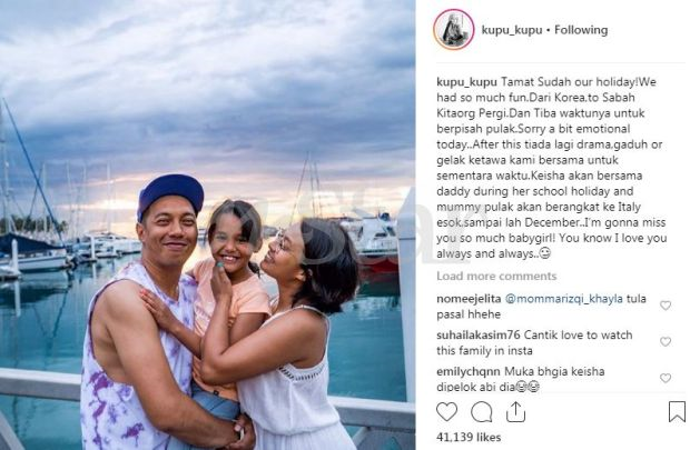 "Keisha akan bersama daddy sepanjang cuti sekolah dia dan mummy pula akan berangkat ke Itali sampai Disember," katanya menerusi laman Instagram.