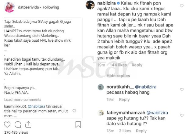 Isu hutang berkenaan dibangkitkan pengacara ini selepas Vida mendakwa Nabil dan Jihan Muse tidak menegurnya ketika dia berada di Konsert Akhir GV5, pada malam Ahad.