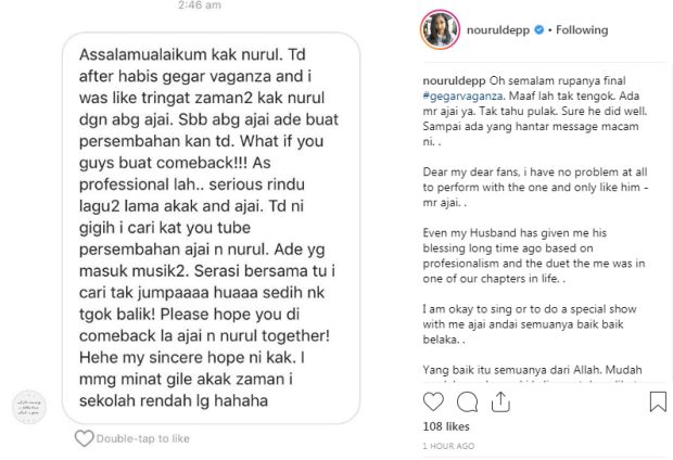 Nourul berkata demikian sebagai respons mesej peminat yang merindui gandingan mereka berdua selepas menonton Ajai membuat persembahan bersama Dia Fadilla di pentas akhir Gegar Vaganza musim kelima pada Ahad lalu.
