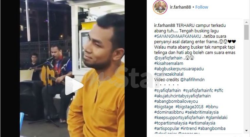 "Walau mata abang busker tak nampak tapi telinga dan hati abang boleh cam suara emas Syafiq Farhain," tulis individu itu.