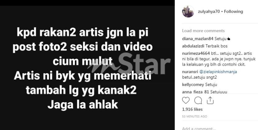 "Kepada rakan-rakan artis janganlah pergi muat naik foto-foto seksi dan video cium mulut.