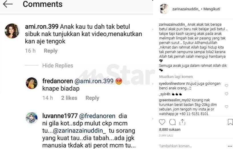 PELAKON Zarina Zainuddin terkilan dengan kata-kata kesat netizen terhadap anak-anaknya selepas dia memuat naik video aktiviti harian bersama mereka.