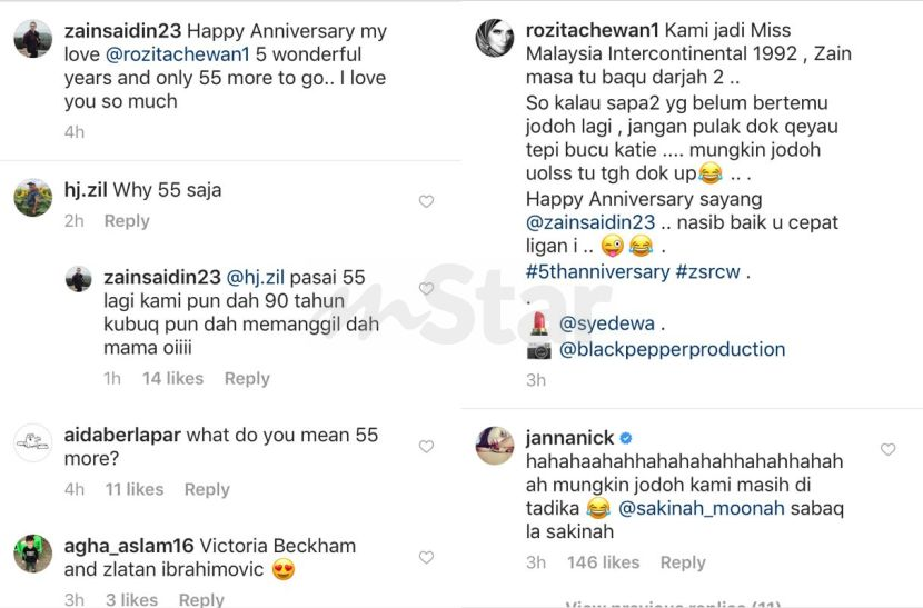 FOTO pasangan selebriti, Rozita Che Wan dan Zain Saidin meraikan ulang tahun kelima perkahwinan mereka menarik perhatian pengikut di laman Instagram.