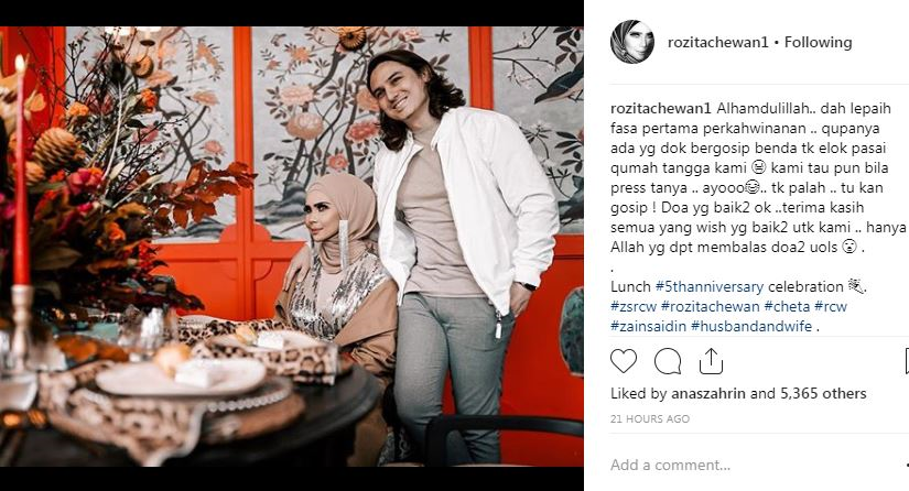 Rozita mendedahkan perkara tersebut menerusi laman Instagram miliknya sempena menyambut ulang tahun perkahwinan mereka yang kelima pada Selasa.