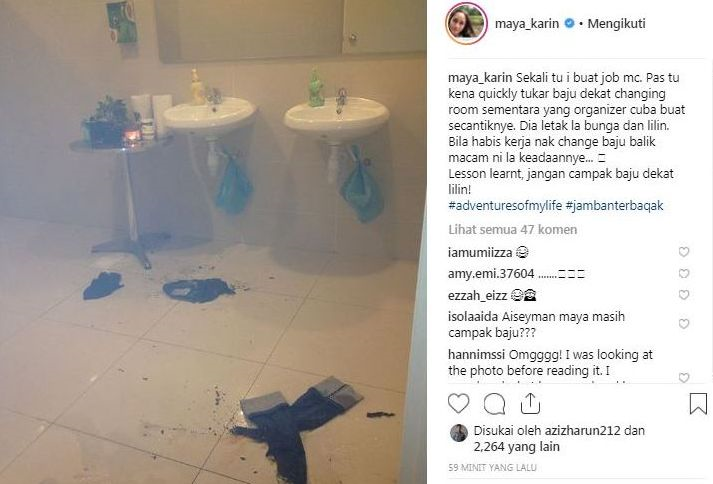 “Pihak penganjur pula hias bilik secantiknya dengan meletakkan bunga dan lilin dalam bilik itu. Apabila habis kerja nak tukar baju balik macam ini keadaannya,” kata Maya.