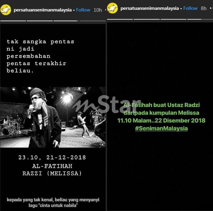 "Innalillahi Wainna Ilay Hiroojiuun. Jenazah ustaz Radzi kumpulan Melissa (55 tahun) telah siap di bedah siasat dan akan dimandikan dan solat jenazah di surau Hospital Kuala Lumpur dijangkakan pukul 12 tengah hari.