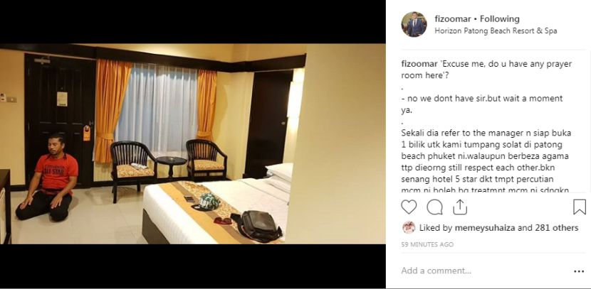Fizo berkata, pada awalnya mereka bertanya sama ada hotel tersebut mempunyai surau namun apabila diberitahu tiada, pengurus yang bertugas tanpa berfikir panjang membuka sebuah bilik khas buat mereka.