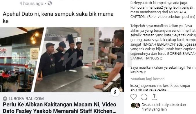 Menerusi kapsyen video berkenaan, Fazley berkata dia seorang yang jarang memarahi pekerjanya, apa yang dimuat naik di video berkenaan hanya lakonan semata-mata.