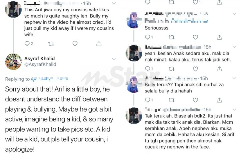 Asyraf menerusi Twitter miliknya membalas komen seorang individu yang menuduh Arif yang baharu berusia setahun itu membuli seorang kanak-kanak lain.