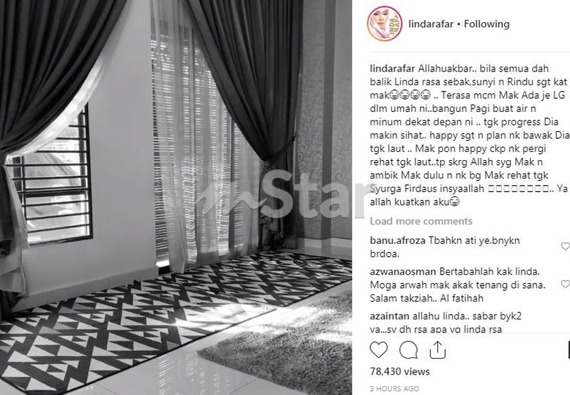 "Allahuakbar... Bila semua dah balik Linda rasa sebak, sunyi dan rindu sangat kat mak. Terasa macam mak ada saja lagi dalam rumah ni.