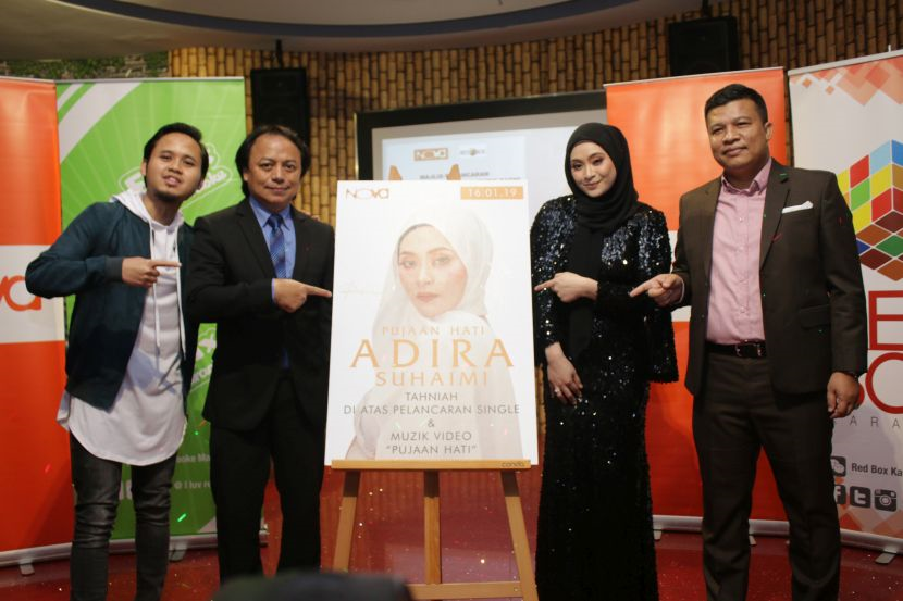 Adira (dua, kanan) bersama (dari kiri) Ikhwan Fatanna, Rosmin Hashim dan Arisz Ab Rahman pada pelancaran lagu terbaharunya.
