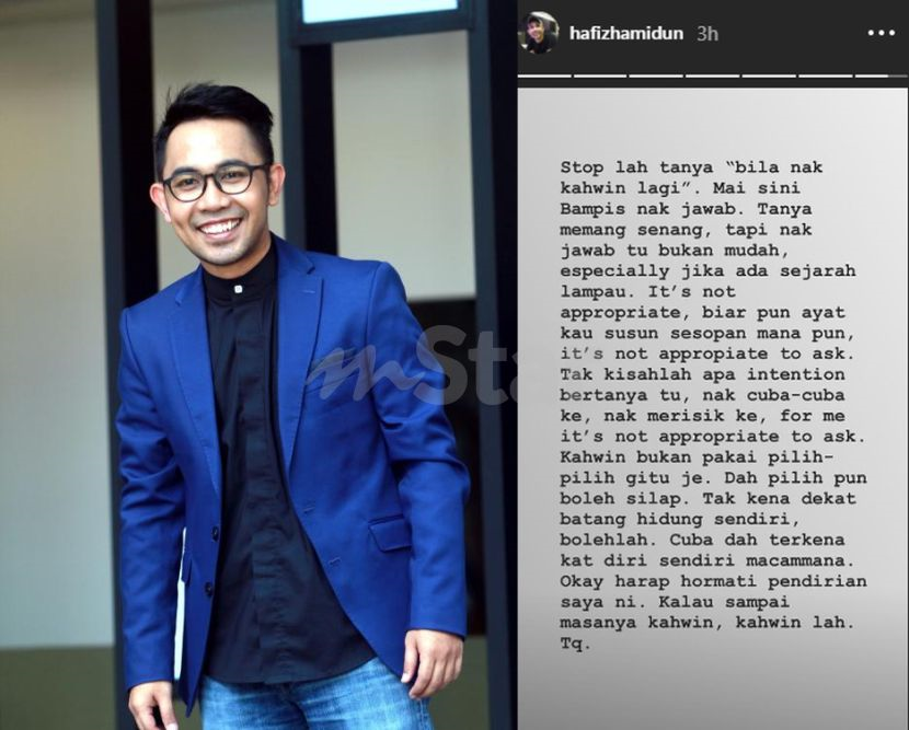 "Berhentilah tanya 'bila nak kahwin lagi'. Mai sini Bampis nak jawab. Tanya memang senang, tapi nak jawab tu bukan mudah terutamanya jika ada sejarah lampau.