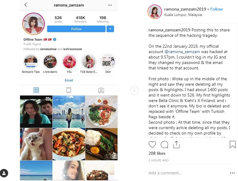 Bercakap lanjut mengenai kejadian itu, Ramonan memberitahu dia menyedari Instagramnya digodam pada Selasa lalu apabila penggodam bertindak menukar kata laluan dan memadam gambarnya.