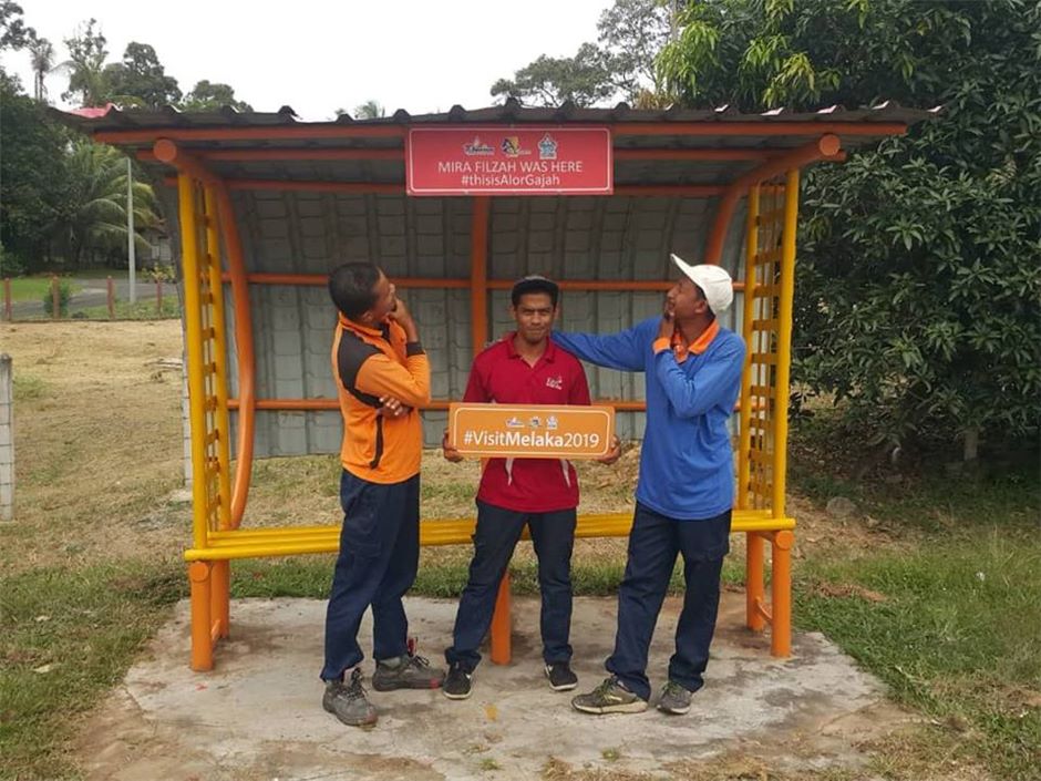 "Terima kasih kepada team Majlis Perbandaran Alor Gajah yang membantu Tourism Melaka mencantikkan bus stop "Mira Filzah" dan memasang papan tanda tersebut.