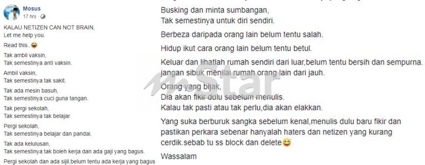 "Tak ambil vaksin, tak semestinya anti vaksin. Tak ambil vaksin, tak semestinya tak sakit. Tak ada mesin basuh, tak semestinya cuci guna tangan.