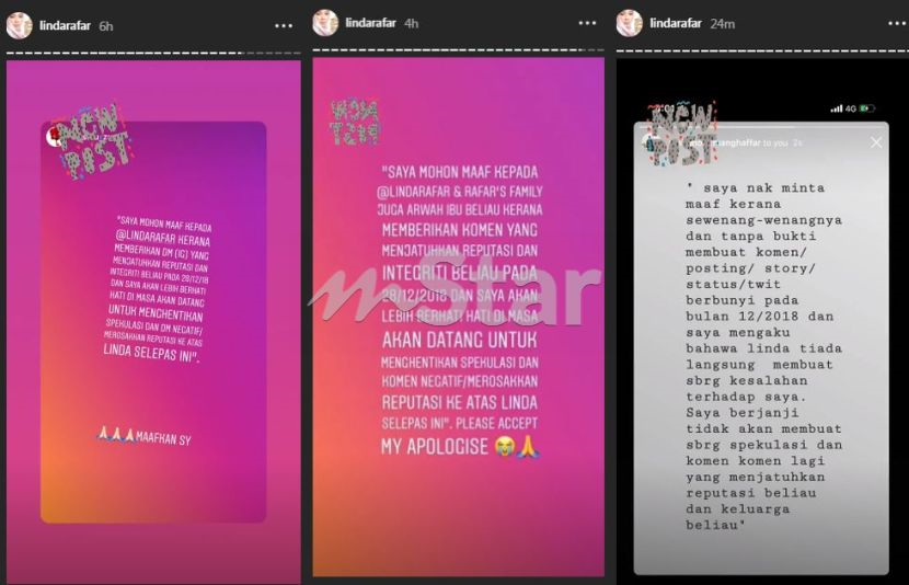 "Saya mohon maaf kepada @lindarafar kerana memberikan DM (IG) yang menjatuhkan reputasi dan integriti beliau pada 28/12/18 dan saya akan lebih berhati-hati di masa akan datang untuk menghentikan spekulasi dan DM negatif/ merosakkan reputasi ke atas Linda selepas ini.