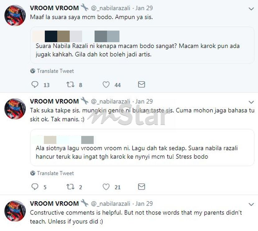 Nabila atau Nur Nabila Mohd Razali, 27, berkata dia boleh sahaja menerima sebarang kritikan negatif yang boleh membantu memperbaiki kelemahannya namun bukan dengan perkataan kesat.