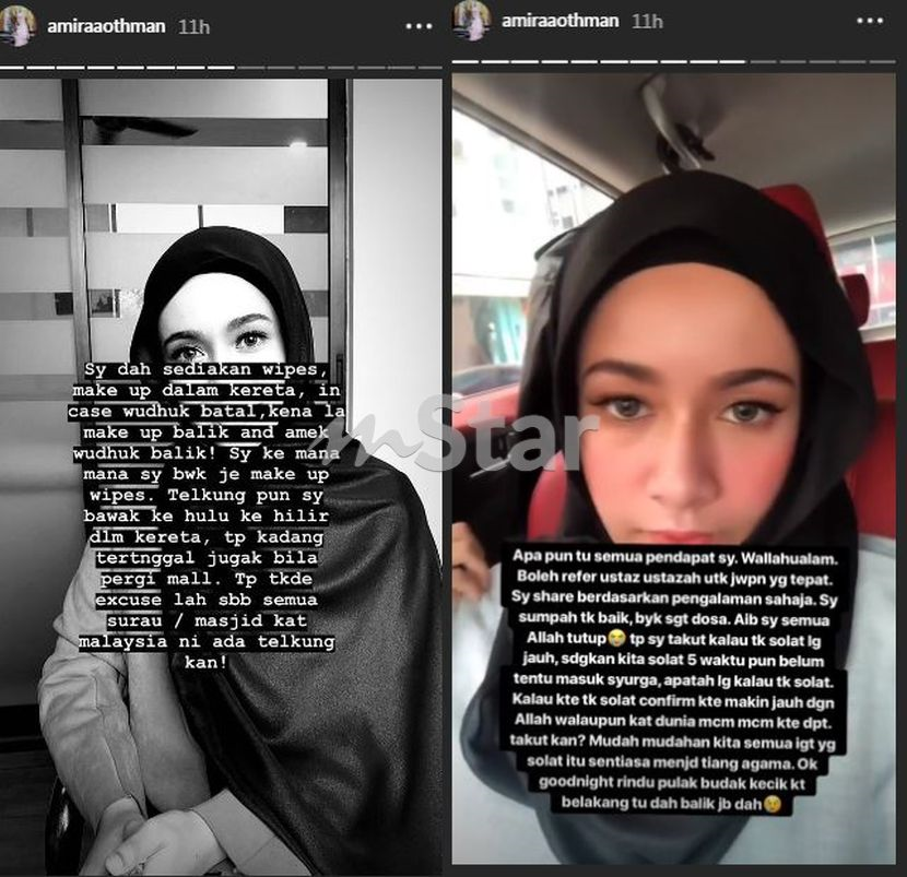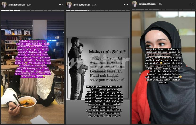 Amira berkongsi perkara itu menerusi laman Instastory selepas menerima pertanyaan daripada peminat yang ingin tahu cara dia menjaga wudhuk dan solat dengan memakai solekan di wajah.