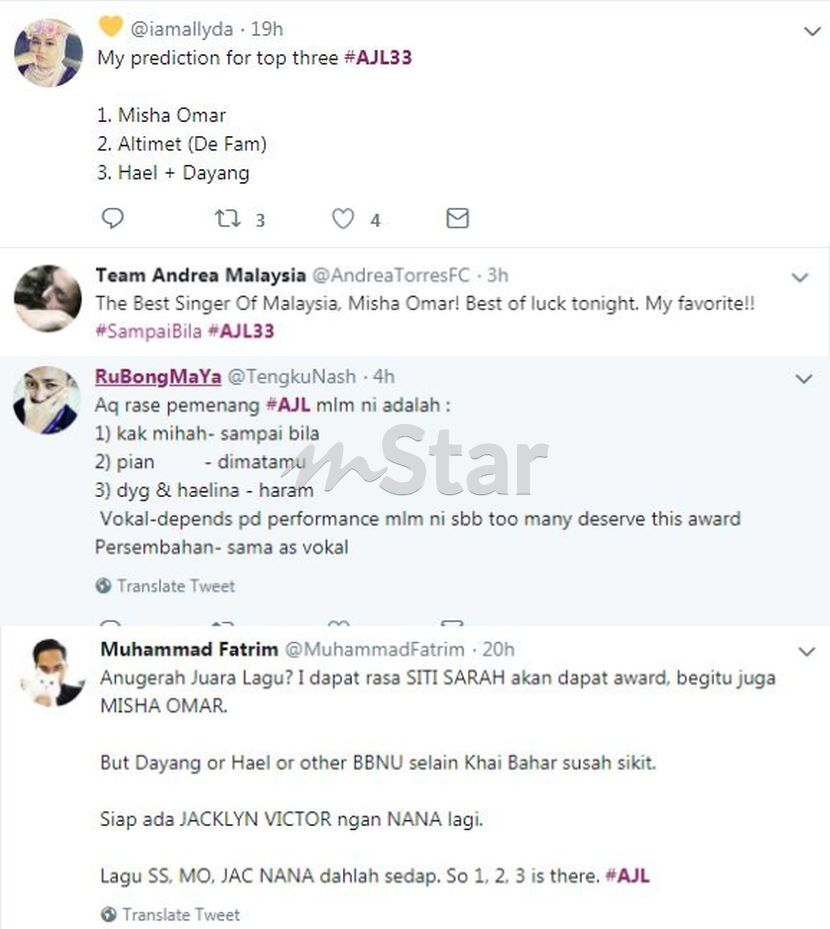 Rata-rata mereka berpendapat penyanyi Misha Omar bakal menjuari AJL33 menerusi lagu Sampai Bila dan lagu Semakin nyanyian Siti Sarah turut dijangka bakal membawa pulang trofi pada malam ini.