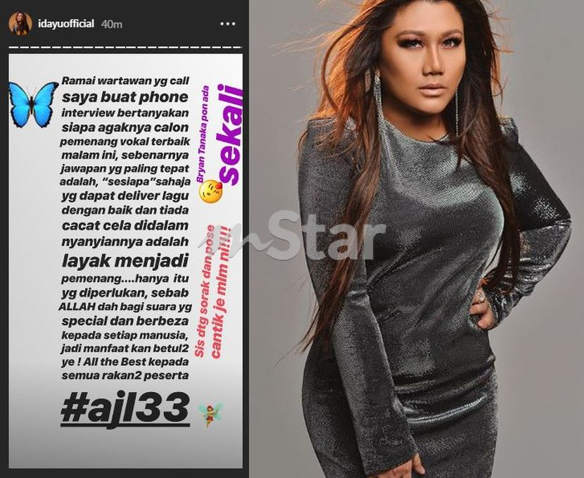 "Semoga berjaya kepada semua rakan-rakan peserta AJL33. Sis datang sorak dan pose cantik saja malam ni!" ujarnya.