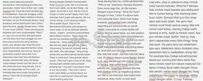 "Tak perlu nak minta maaf pada semua orang. Bila kita minta maaf ikhlas, mereka cakap wey senang la artis, salah saja minta maaf maaf. Apa pun minta maaf, selesai.