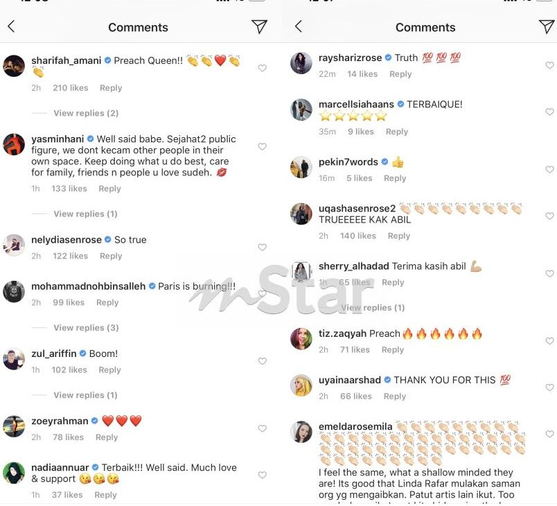 Dia berkata sedemikian menerusi laman Instagramnya dan ramai selebriti seperti Zul Ariffin, Nelydia Senrose, Sharifah Amani dan Sherry Al-Hadad mengucapkan terima kasih kepadanya yang telah bersuara bagi pihak mereka.
