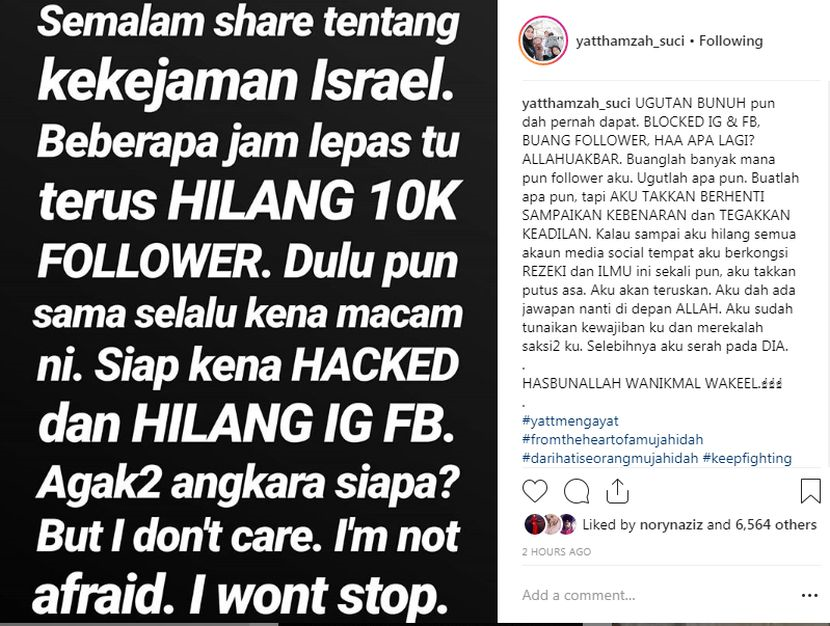 "Semalam kongsi tentang kekejaman Israel dan beberapa jam lepas itu terus hilang 10,000 pengikut. Dulu pun sama, selalu kena macam ni. Siap kena godam dan hilang Instagram dan Facebook.