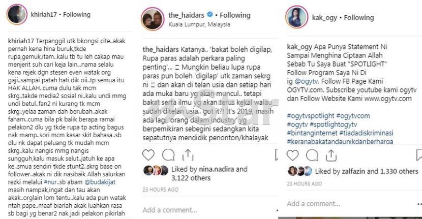Noorkhiriah, Que Haidar dan Ogy Ahmad Daud antara selebriti yang tidak bersetuju dengan kenyataan A. Aida.